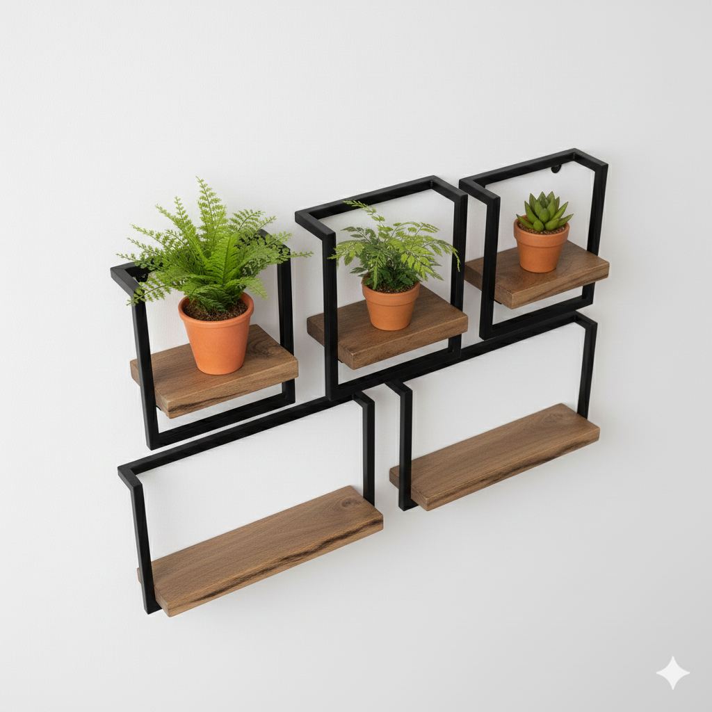Všechny police mají černý kovový rám a jsou doplněny jednou spodní policí ze dřeva (pravděpodobně světlý dub nebo ořech) pro umístění dekorací, jako jsou květináče. Sada je ideální pro vytvoření individuální galerie na stěně.